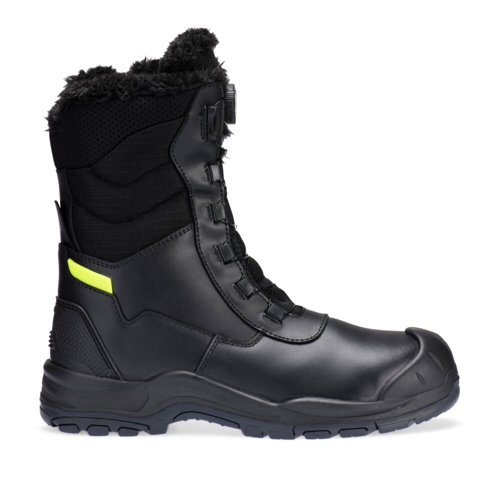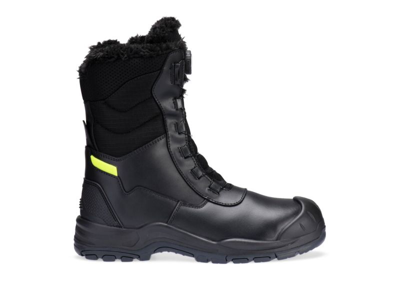 Acél orrmerevítővel, kompozit talpátszúrás elleni talplemezzel, hőálló külső talppal (300°C), hideg elleni szigeteléssel, energiaelnyelő sarokkal, gyorsan kioldható drótfűzős rögzítő rendszerrel, komfortos meleget nyújtó szőrmebéléssel, strapabíró orrborítással, a nagyobb láthatóság és biztonság érdekében fényvisszaverő szegéllyel, csúszásmentes PU/gumi talppal és CE minősítéssel rendelkező antisztatikus munkavédelmi bakancs.