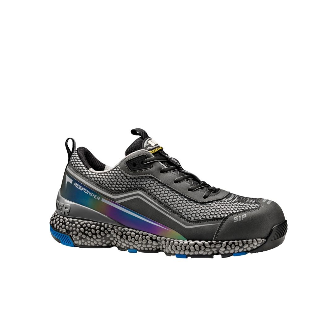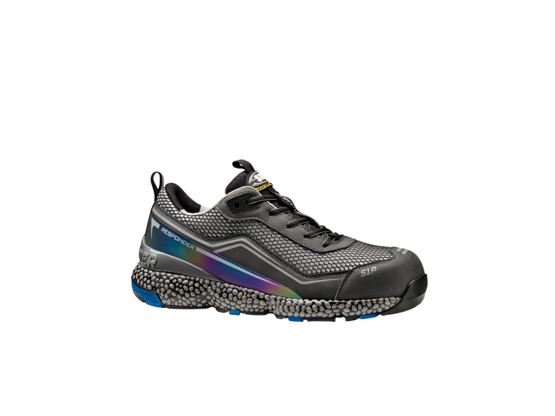 Sir Future termékcsaládhoz tartozó Sir Safety System munkavédelmi cipő ultradinamikus kialakítással, kompozit orrmerevítővel és középtalppal, Air-Mesh/Mikroszálas felsőrésszel és fényvisszaverő betétekkel. A Responder® középtalp átfogja a talpat teljes hosszában és szélességében, rugalmasságot és kifinomult párnázást biztosítva. A mély, hosszirányú barázdákkal ellátott gumi külső talp elősegíti az egész talp rugalmasságát és kiváló tapadást biztosít minden típusú felületen. A sarokstabilizátor megakadályozza a láb kifáradását és javítja a láb stabilitását. A poliészter hálós bélés kiváló vízelvezető képességgel rendelkezik, köszönhetően a szövetnek és a nagy nedvszívó képességű szerkezetnek. EN ISO 20345 S1P SRC